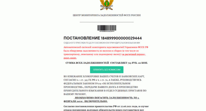 В ведомстве уточнили, что фейковые уведомления, в частности, приходят от некоего «Центра мониторинга задолженностей ФССП России».