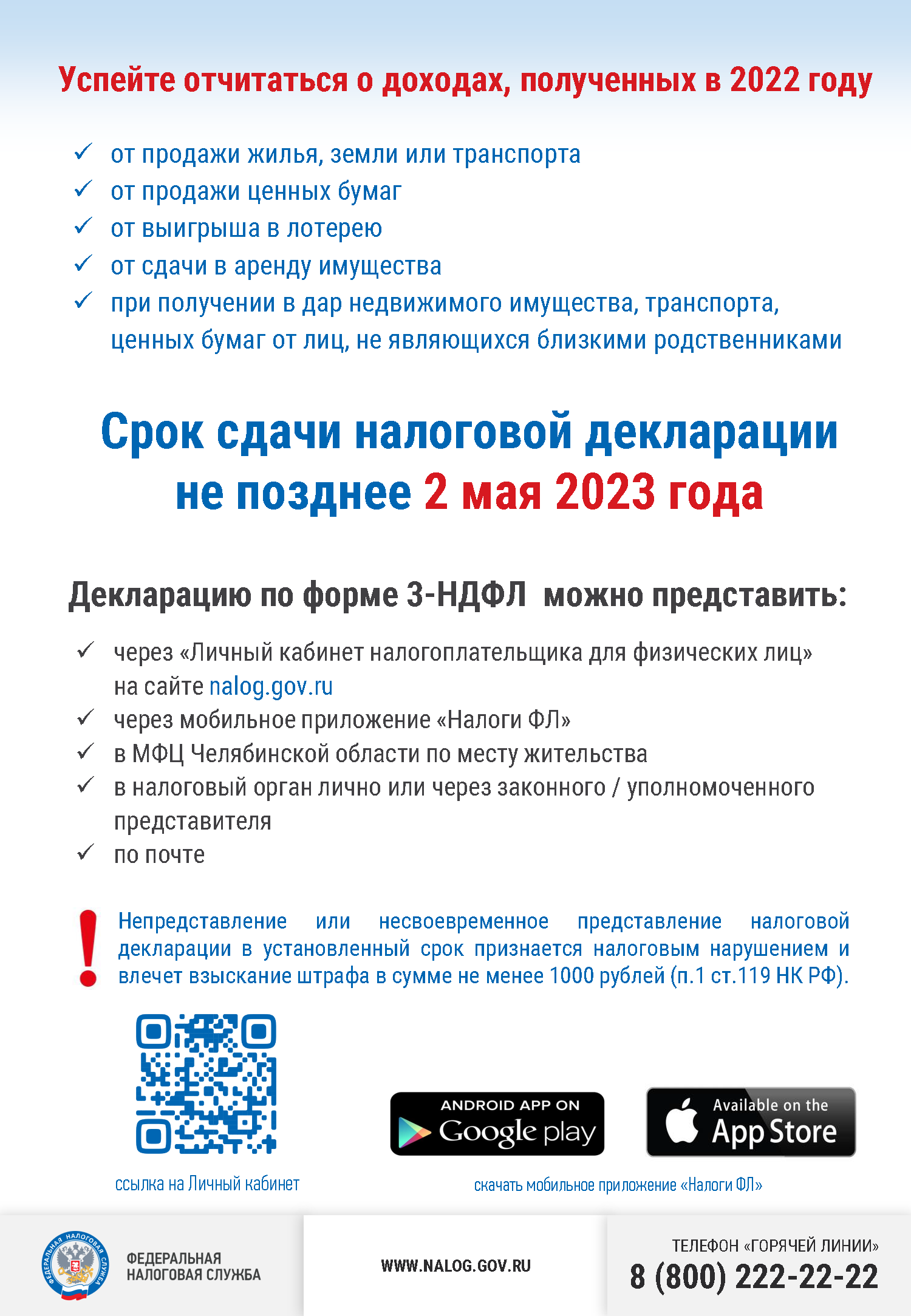ФНС напоминает, что налоговые декларации за 2022 год необходимо подать не позднее 2 мая.