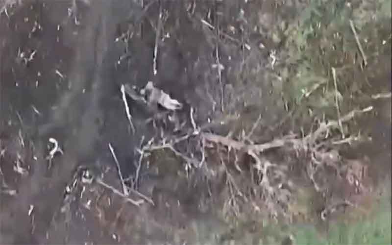 На кадрах видео, снятом с квадрокоптера ВСУ, спрятавшись за поваленным деревом, лежит солдат. В это время на него оператор коптера сбрасывает гранату.