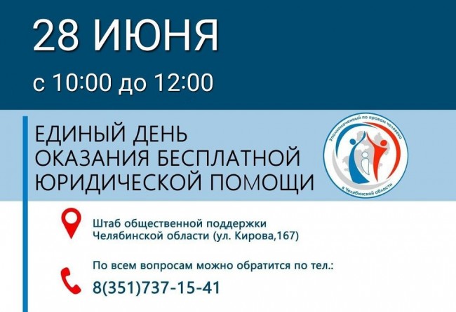 28 июня в Штабе общественной поддержки Челябинской области южноуральцы смогут получить бесплатную юридическую помощь по всем интересующим вопросам.