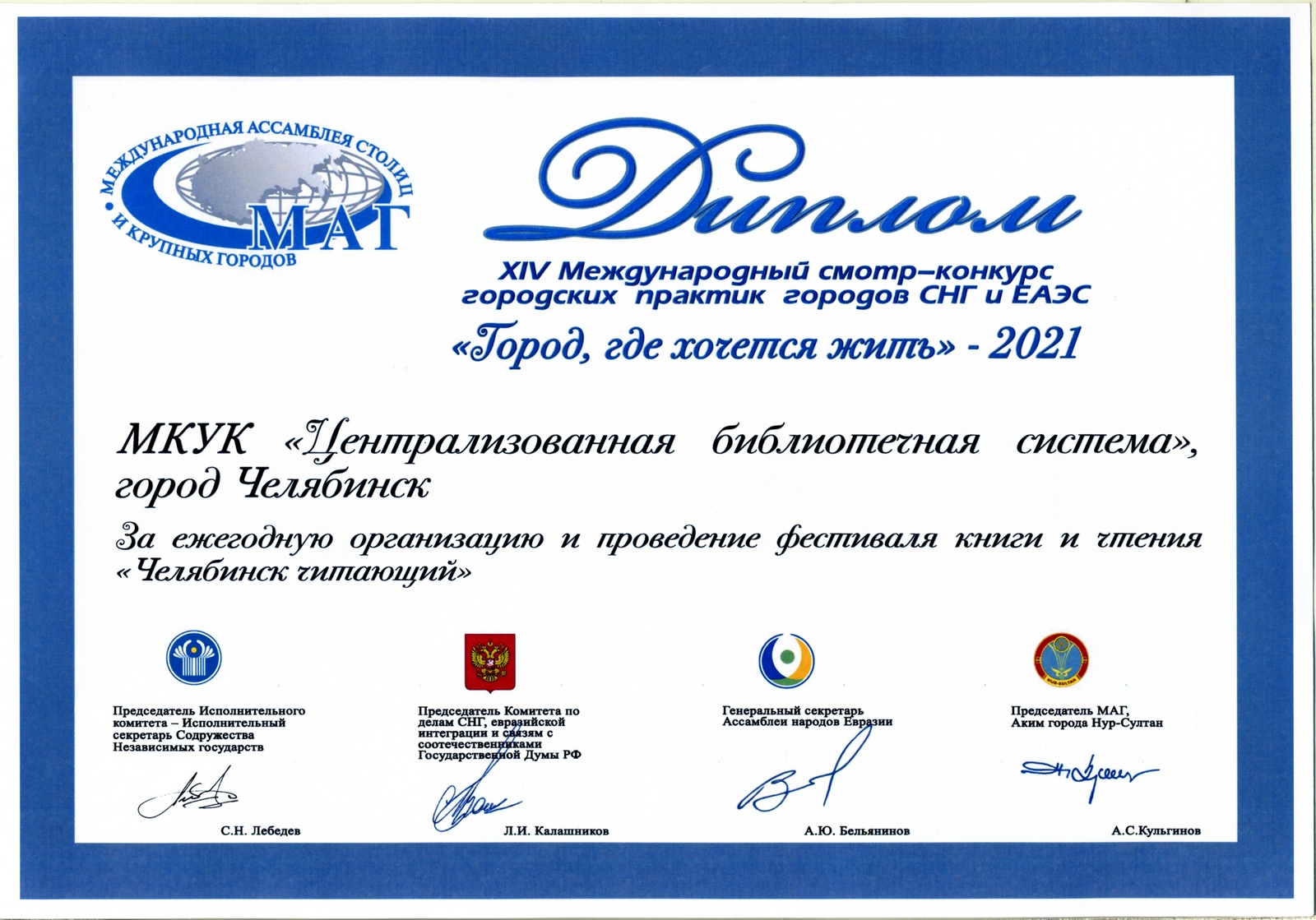 МКУК «Централизованная библиотечная система», город Челябинск получили диплом XIV Международного смотра-конкурса городских практик городов СНГ и ЕАЭС «Город, где хочется жить» . Библиотеки и Город отметили за ежегодную организацию и проведение фестиваля книги и чтения «Челябинск читающий».