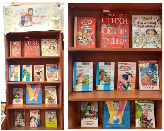 В Еманжелинской сельской библиотеке накануне 8 Марта для наших милых читательниц открыта выставка «Про дочек, мам и бабушек» с веселыми книгами и стихами, рассказывающими о девочках и женщинах.