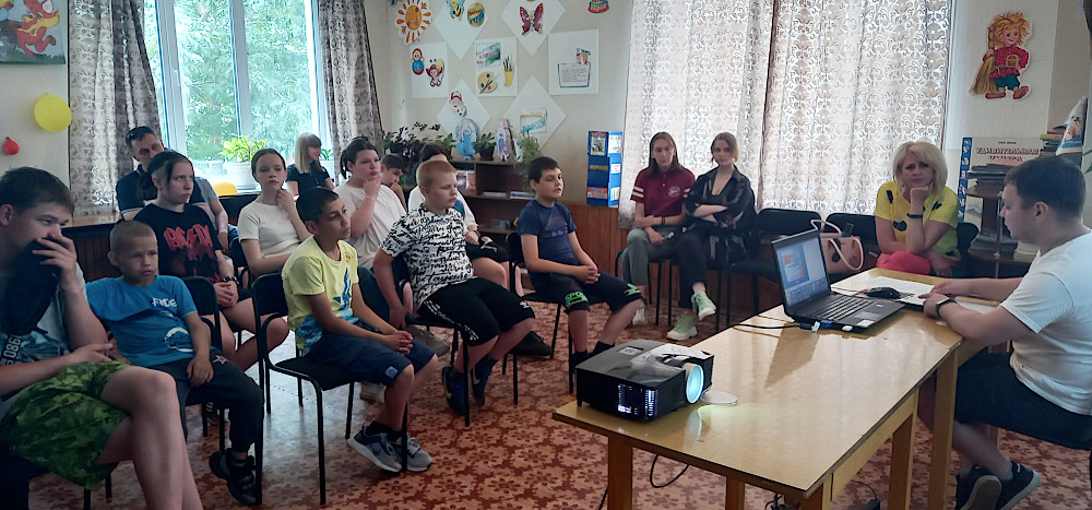 Библиотекарь Дмитрий Петухов рассказал подросткам из трудового отряда и лагеря дневного пребывания для детей, требующих особого внимания при Комиссии по делам несовершеннолетних об истории Олимпийских игр.