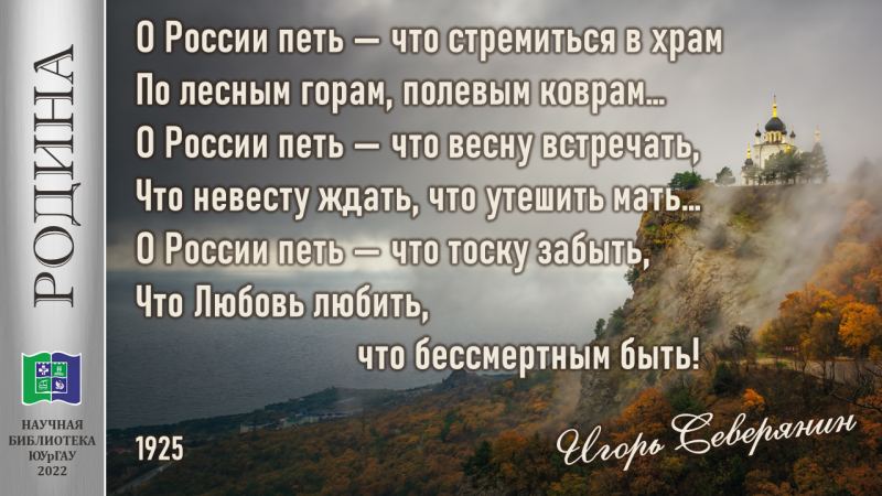 О России петь — что стремиться в храм По лесным горам, полевым коврам… О России петь — что весну встречать, Что невесту ждать,