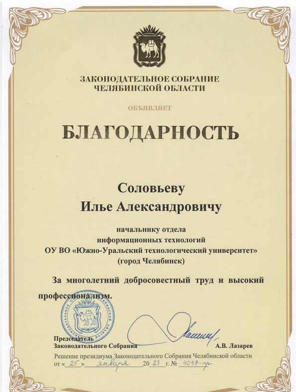 Решением Президиума Законодательного Собрания Челябинской области от 25.01.2023 г. №4047-пр за многолетний добросовестный труд и высокий профессионализм вручены Благодарственные письма Законодательного Собрания Челябинской области заведующему кафедрой «Строительство, архитектура и дизайн», доценту Епифановой Анастасии Геннадьевне и начальнику отдела информационных технологий Соловьеву Илье Александровичу.