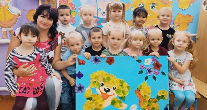 — Это наша коллективная работа «Любимые питомцы», приуроченная ко Дню защиты животных. Что касается времён года, то в приёмной нашей группе тоже наступила осень, чтобы радовать всех вошедших яркими красками!