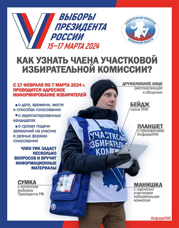 Сотрудники участковых избиркомов Челябинской области проведут поквартирные обходы для информирования граждан о президентских выборах, которые состоятся с 15 по 17 марта 2024 года,