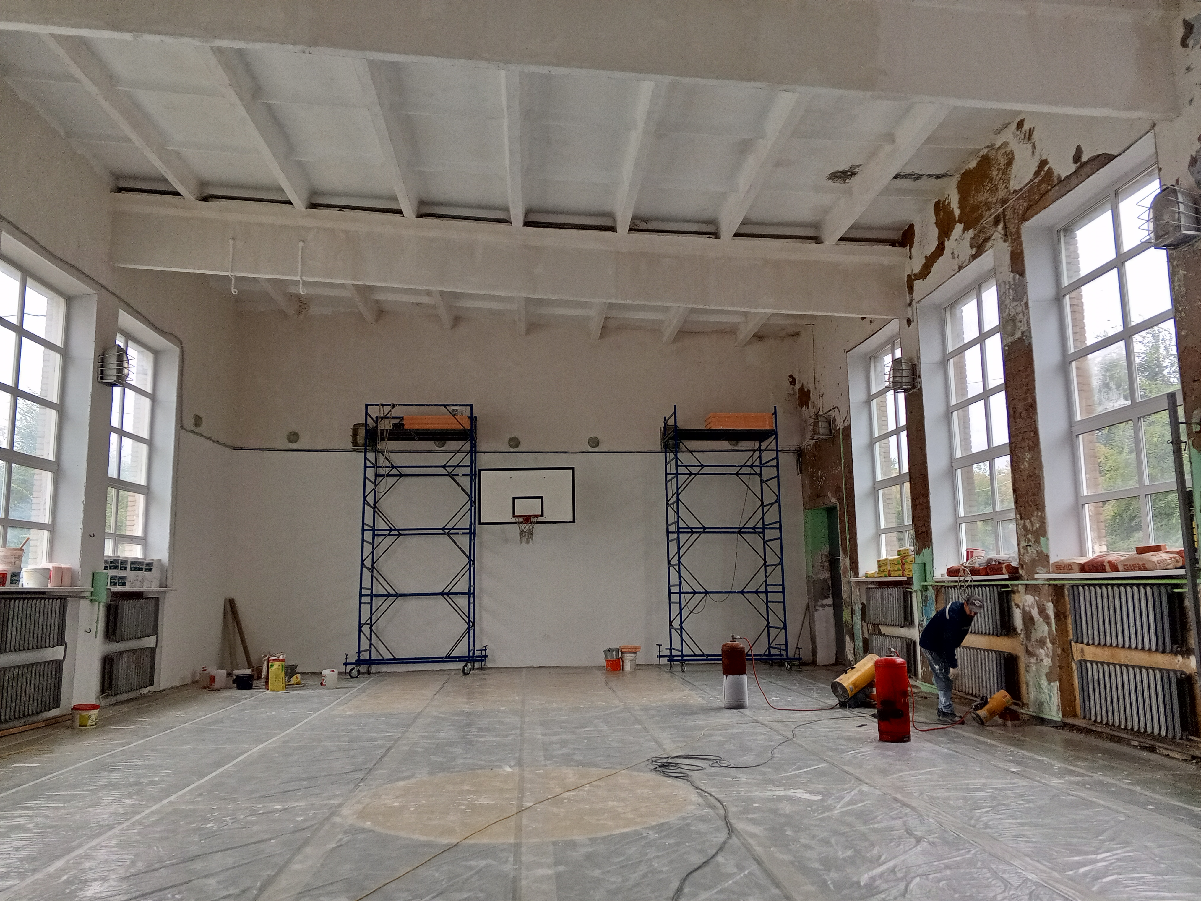 В текущий момент идет завершение работ по внутренней отделке и восстановлению спортзала.