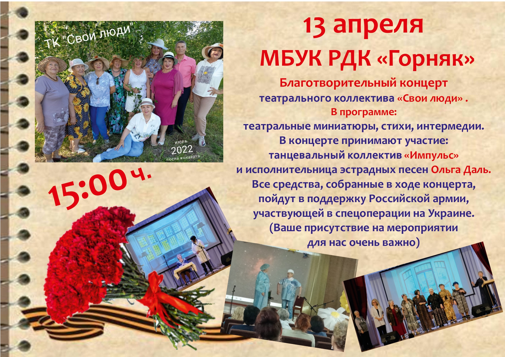13 апреля в 15-00 ч. в РДК «Горняк» состоится благотворительный концерт театрального коллектива «Свои люди». Все собранные средства будут направлены на поддержку российских военнослужащих, участвующих в специальной операции на Украине! Подробнее – в афише.