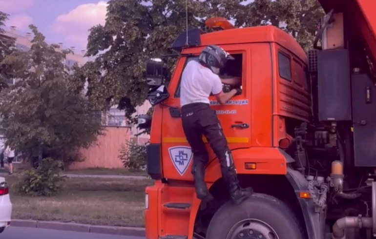 Как сообщили очевидцы, инцидент произошёл ещё в минувшую пятницу, 8 июля. Причиной дорожных разборок стало то, что водитель КАМАЗа якобы не пропустил мотоциклиста. Того это возмутило и он набросился с кулаками на обидчика.