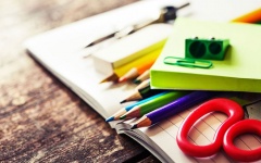 Рюкзак, синего и красного цветов, пенал, точилки, пластилин, ластики, набор цветных ручек, ножницы, ручка-корректор, краски акварельные и гуашь, кисточки, обложки для учебников, обложки для тетрадей, папки для тетрадей, набор цветной бумаги, набор цветного картона, альбом для рисования, линейки, цветные карандаши 12 — 36 цветов, фломастеры 6 — 24 цветов, подставки для книг, карандаши черно-белые, ручки (синие), клей-карандаш, клей канцелярский, тетради 12 листов (клетка), тетради 12 листов (линейка), тетради 24 листа (линейка), тетради 18 листов (клетка), тетради 48 листов (клетка), дневники, корректоры, маркеры, передники для творчества.