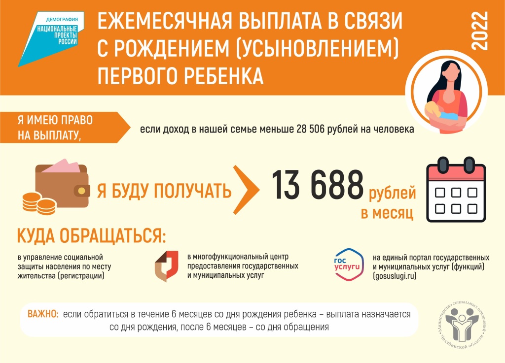 Напомним, с 1 июня 2022 года по поручению Президента Российской Федерации Владимира Путина размер ежемесячной денежной выплаты в связи с рождением (усыновлением) первого ребёнка и ежемесячной выплаты в случае рождения третьего или последующих детей увеличен на 10%, до 13 688 рублей. Право на ежемесячную выплату в связи с рождением (усыновлением) первого ребёнка имеют семьи со среднедушевым доходом ниже 28 506 рублей (в 2022 году). Если обратиться за выплатой в течение 6 месяцев со дня рождения ребёнка, то она будет назначена со дня рождения, после 6 месяцев – со дня обращения.