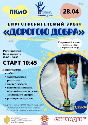 Второй благотворительный забег "ДОРОГОЮ ДОБРА" в поддержку центра помощи детям с ограниченными возможностями и молодым инвалидам БУМЕРАНГ ДОБРА Снежинск состоится в "Парке Культур