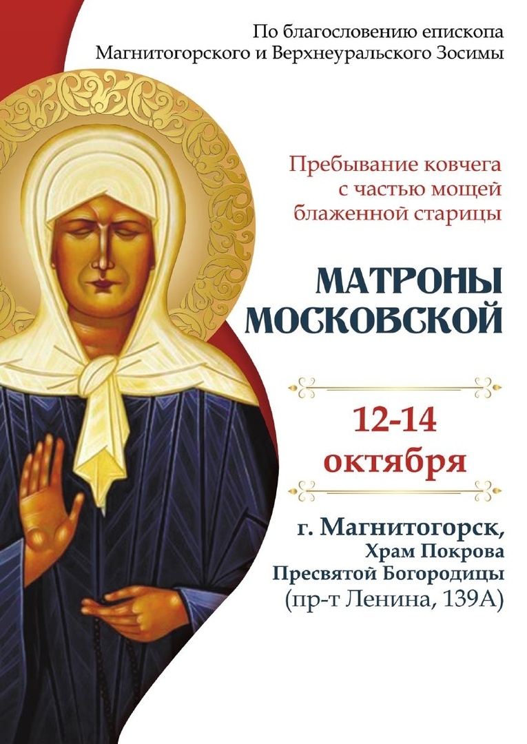 Мощи блаженной старицы прибудут в Магнитогорск с родины святой Матроны – из Тульской епархии. Встреча ковчега с частью мощей блаженной старицы Матроны Московской состоится 12 октября в 10:00 по адресу: пр. Ленина, 139а.