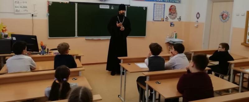 В начале прошлой недели, 26 декабря, клирик Никольского соборного храма Сатки протоиерей Дмитрий Гудков посетил 4 класс школы № 10, сообщают представители Златоустовской епархии.