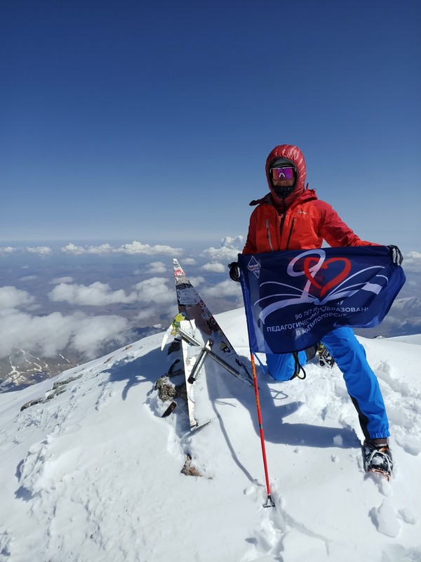 Как и обещала Елена Мицан, она подняла на самую высокую точку Европы флаг института гуманитарного образования МГТУ им. Г.И. Носова, который для неё сделали директор Татьяна Абрамзон и коллеги с кафедры дошкольного и специального образования.
