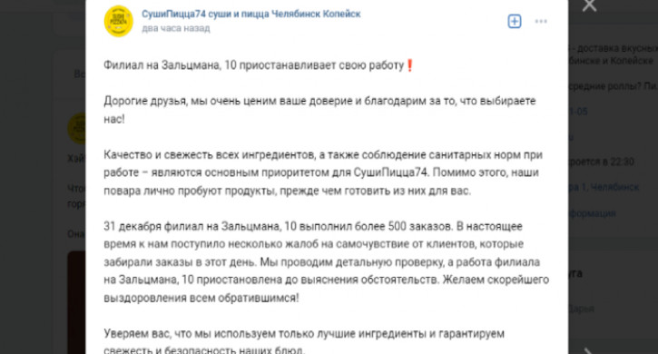 Руководство ресторана доставки отмечает, что 31 декабря филиал на Зальцмана, 10 выполнил более 500 заказов. «В настоящее время к нам поступило несколько жалоб на самочувствие от клиентов, которые забирали заказы в этот день. Мы проводим детальную проверку, а работа филиала на Зальцмана, 10 приостановлена до выяснения обстоятельств.