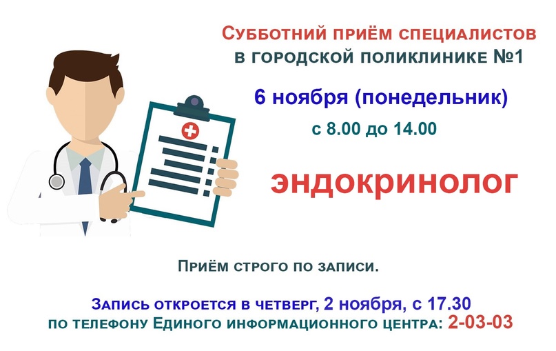 В городской поликлинике №1 (ул. Октябрьская, 17) продолжаются приемы врачей-специалистов. В связи с праздничным днем 4 ноября, субботний прием переносится на понедельник 6 ноября. Прием будет вести врач-эндокринолог.