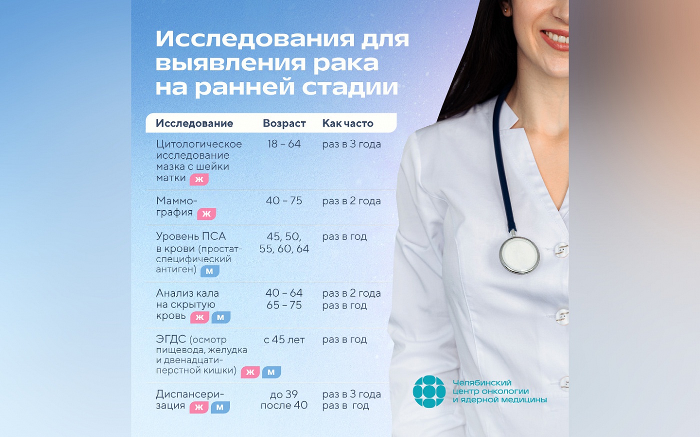 – В диспансеризацию включен массивный блок онкологических скринингов, объем которых и частота проведения определены возрастом и полом пациента. Исследования направлены на раннее выявление злокачественных новообразований по тем группам заболеваний, которые являются наиболее распространенными в определенном возрасте, – объяснили в Челябинском областном клиническом центре онкологии и ядерной медицины.